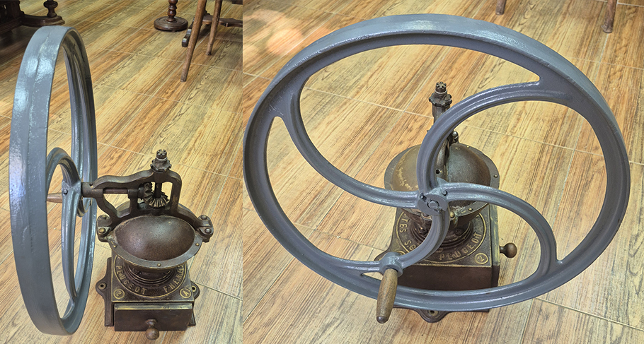 600001- מטחנת קפה מצרפת גדולה ומרשימה,עתיקה,חתומה,עשויה מברזל ועץ ב1100 ש' בלבד