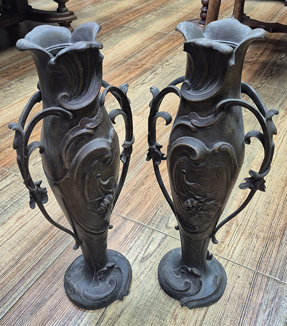 6000056- זוג אגרטלים צרפתיים תקופת הארט נונו 1895-1920 עשויים ברונזה מרוקעים ומעוטרים גובה 50 ס"מ ב1600 ש' בלבד