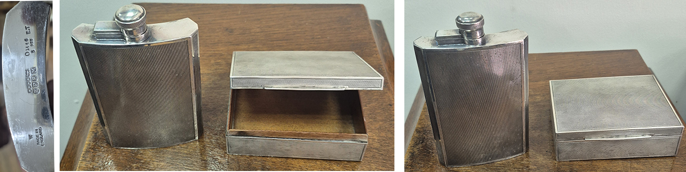 700072- סט יוקרתי לגבר מכסף ארט דקו מאת ג'יממס דיקסון ובניו אנגליה חתום, פלאסק לשתיית אלכוהול 15*9 ס"מ וקופסה לסיגרים 12*10 ס"מ ב990 ש' בלבד